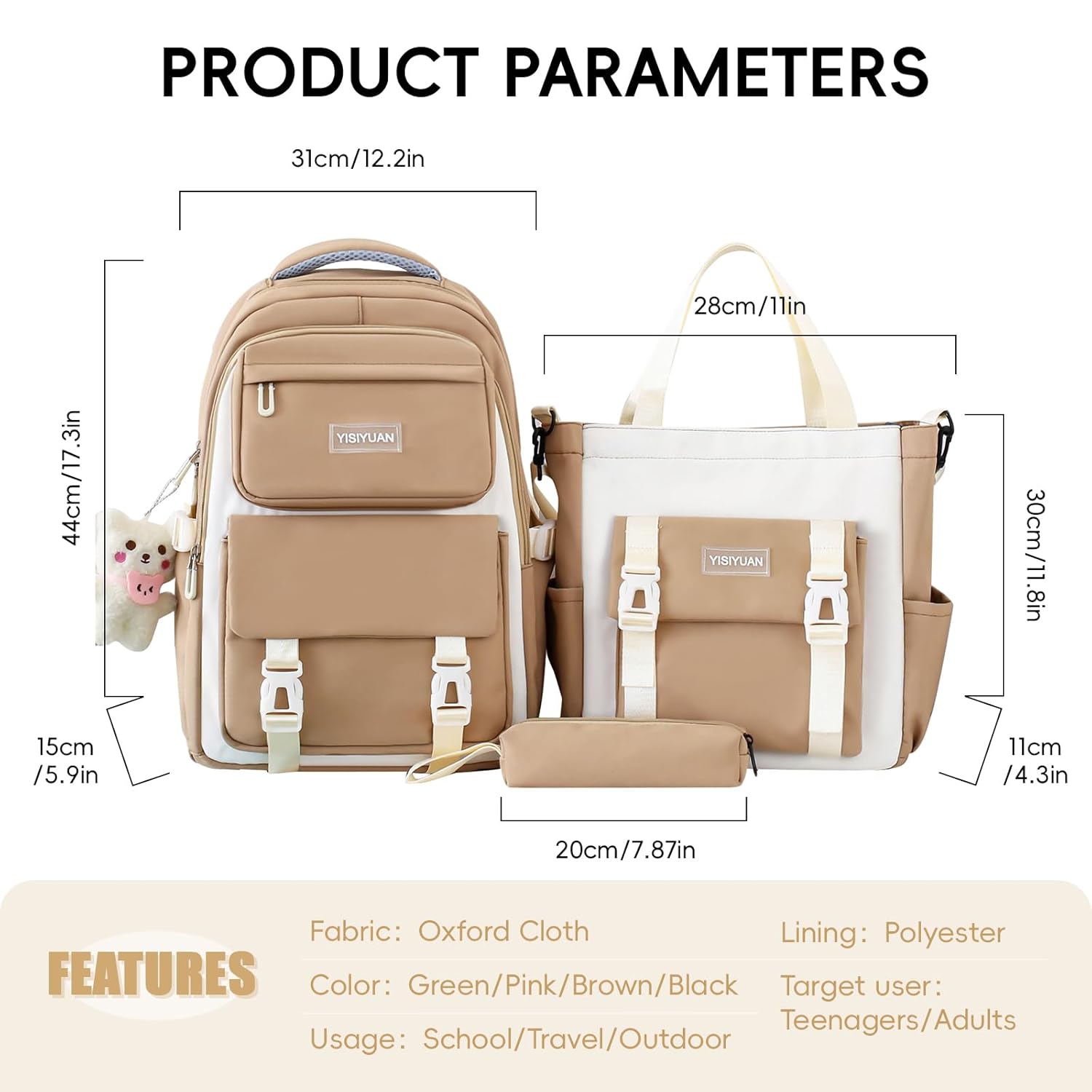 Amythe YY622 School Backpack Set for Girls, 3 Pieces, 2025 School Bag with Shoulder Bag, Pencil Case for School Travel, School Bag Casual, khaki