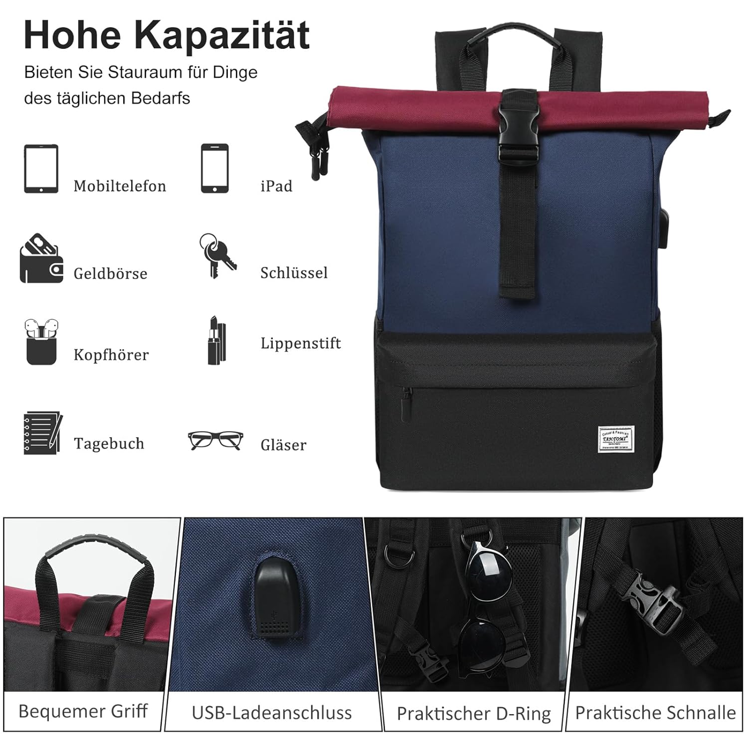 Schreibe die erste Rezension für „TANTOMI Rucksack Damen Groß Schulrucksack Herren Großes Mehrfächerfach mit 15,6“ Laptopfach, Unisex Rolltop Rucksack für den Arbeitsalltag“